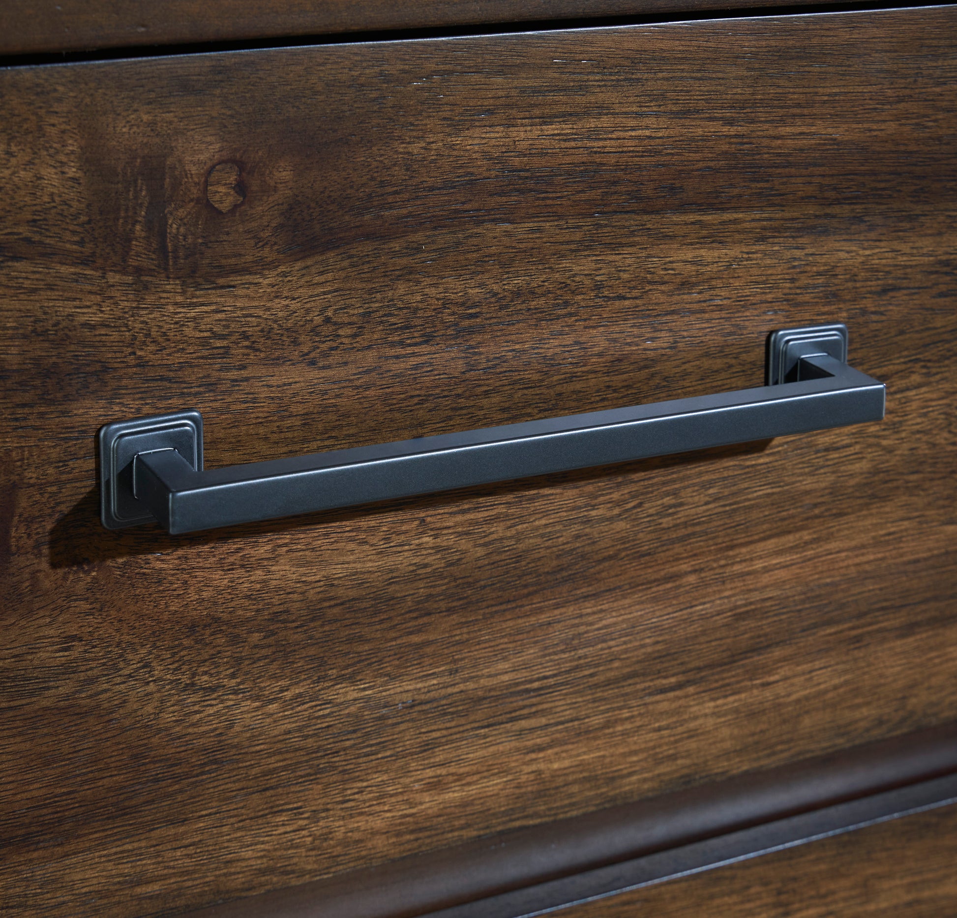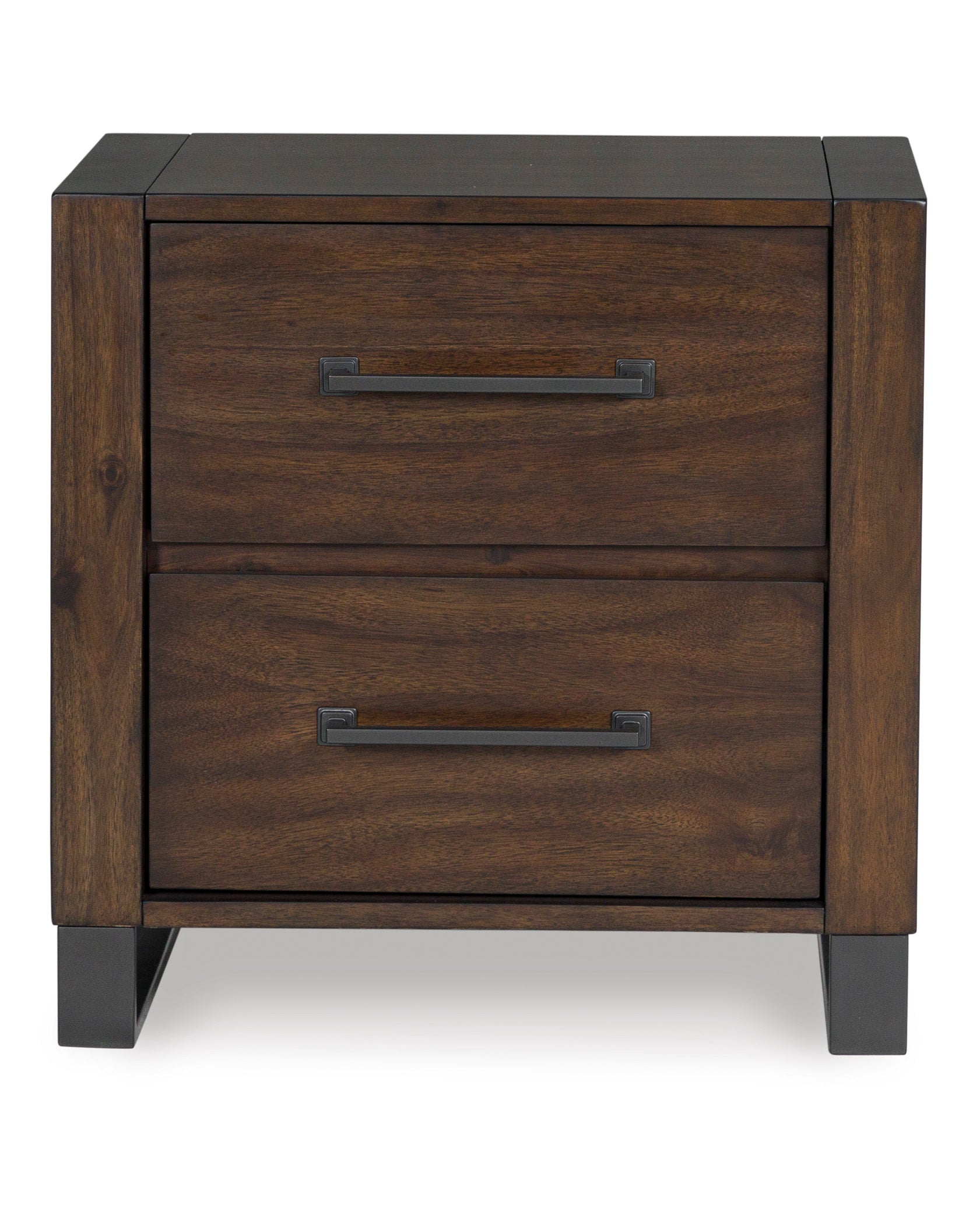 • This nightstand is urban contemporary style at its finest. Pairing the beauty of wood with a metal sled base and handles in a gunmetal finish, it offers a splendid industrial vibe. The roomy, clean-lined drawers are oh-so-handy for bedside storage. What a dynamic way to wake up your bedroom style.